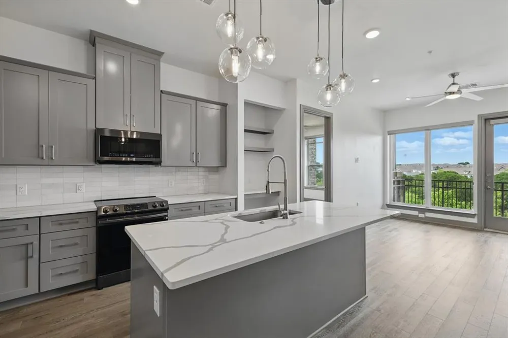 Experience urban living at The View, a luxury mixed-use community in the heart of Carrollton. Overlooking the Furneaux Creek Nature Area and located along the Blue Trail, residents enjoy direct access to scenic walking and biking trails, along with walkable access to a variety of dining, parks, and retail. This spacious 2-bedroom, 2-bath condo is located on the 3rd floor and offers tranquil views of the greenbelt and Blue Trail from both the living area, bedrooms and private balcony. Inside, you'll find a well-appointed kitchen with quartz countertops and a built-in desk area that’s perfect for working from home. The open-concept living room is filled with natural light and flows seamlessly onto the balcony patio. The primary suite features dual sinks, a soaking tub, separate walk-in shower, and a generous walk-in closet. The secondary bedroom includes its own ensuite bathroom for added privacy. Additional highlights include laundry closet that fits a stackable washer & dryer, window coverings throughout, and direct access to resort-style amenities located within the building—including a pool, fitness center, yoga studio, dog park, dog wash station, two outdoor grilling areas, bike storage, and a two-story clubhouse with social lounges, meeting spaces, and more. 2 reserved parking spots included in the secure parking garage. Conveniently located near H-Mart, 99 Ranch Market, Walmart, Lowe’s, Downtown Carrollton and major highways for easy commuting throughout the Metroplex. Parking spaces - 3049 & 3050